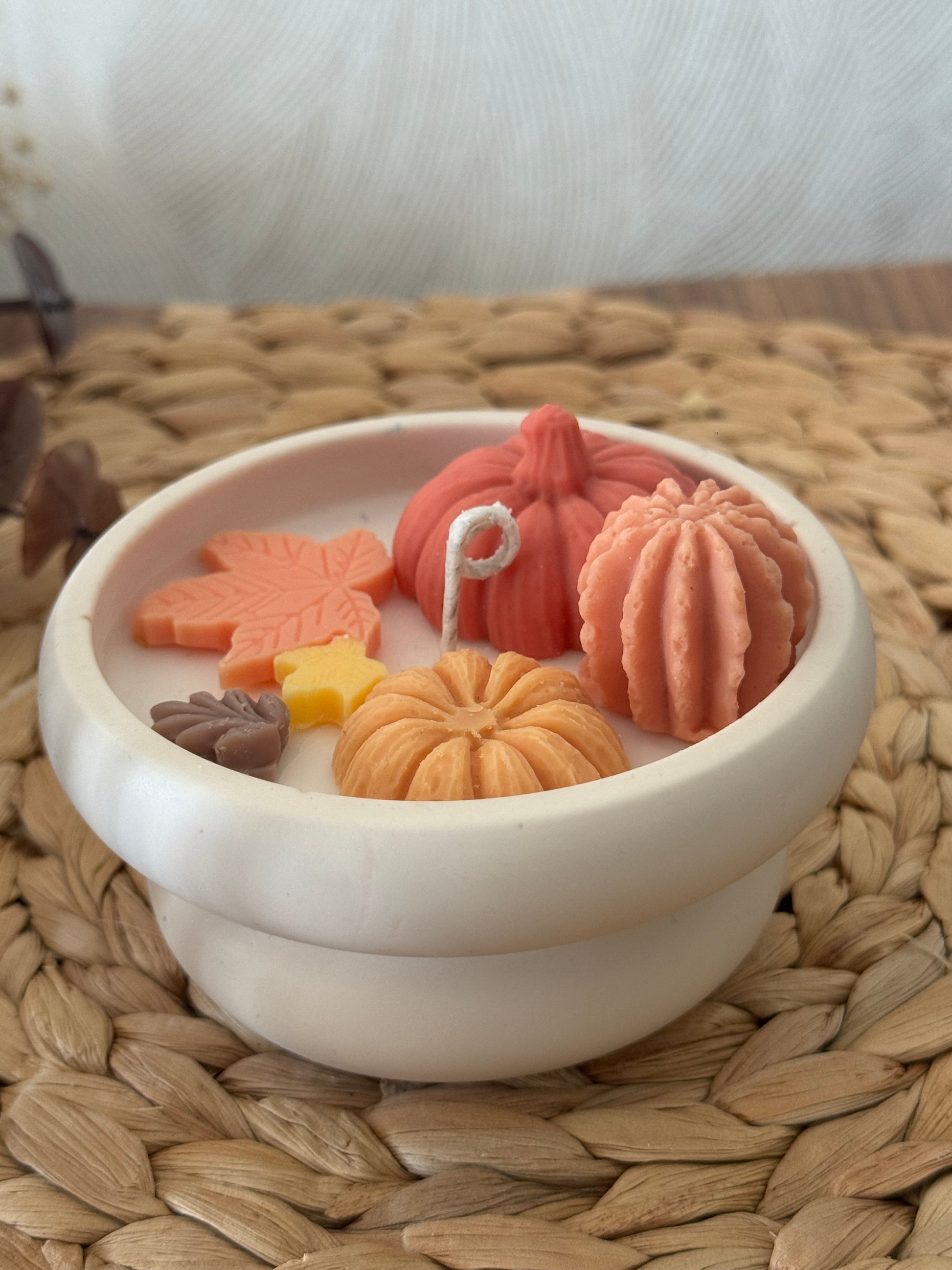 Una vela artesanal que captura la esencia del otoño con un diseño inspirado en los frutos de la cosecha. Elaborada a mano con cera vegetal y decorada con mini figuras detalladas, combina estética y aroma para crear un ambiente acogedor y único.